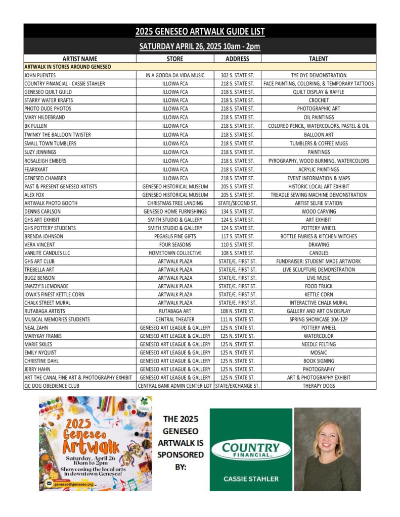 Geneseo’s popular Artwalk is back and better than ever in 2025! The Geneseo Artwalk showcases local art and is Saturday April 26, 2025 in Downtown Geneseo.