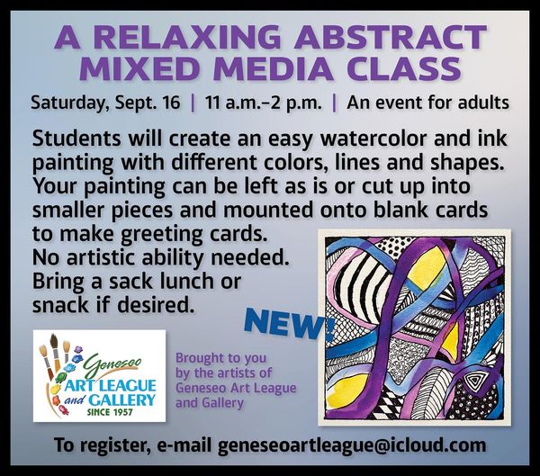 Join us at the Geneseo Art League and Gallery on Saturday, September 16 from 11 to 2 for a relaxing abstract mixed media class! To register, email geneseoartleague@icloud.com