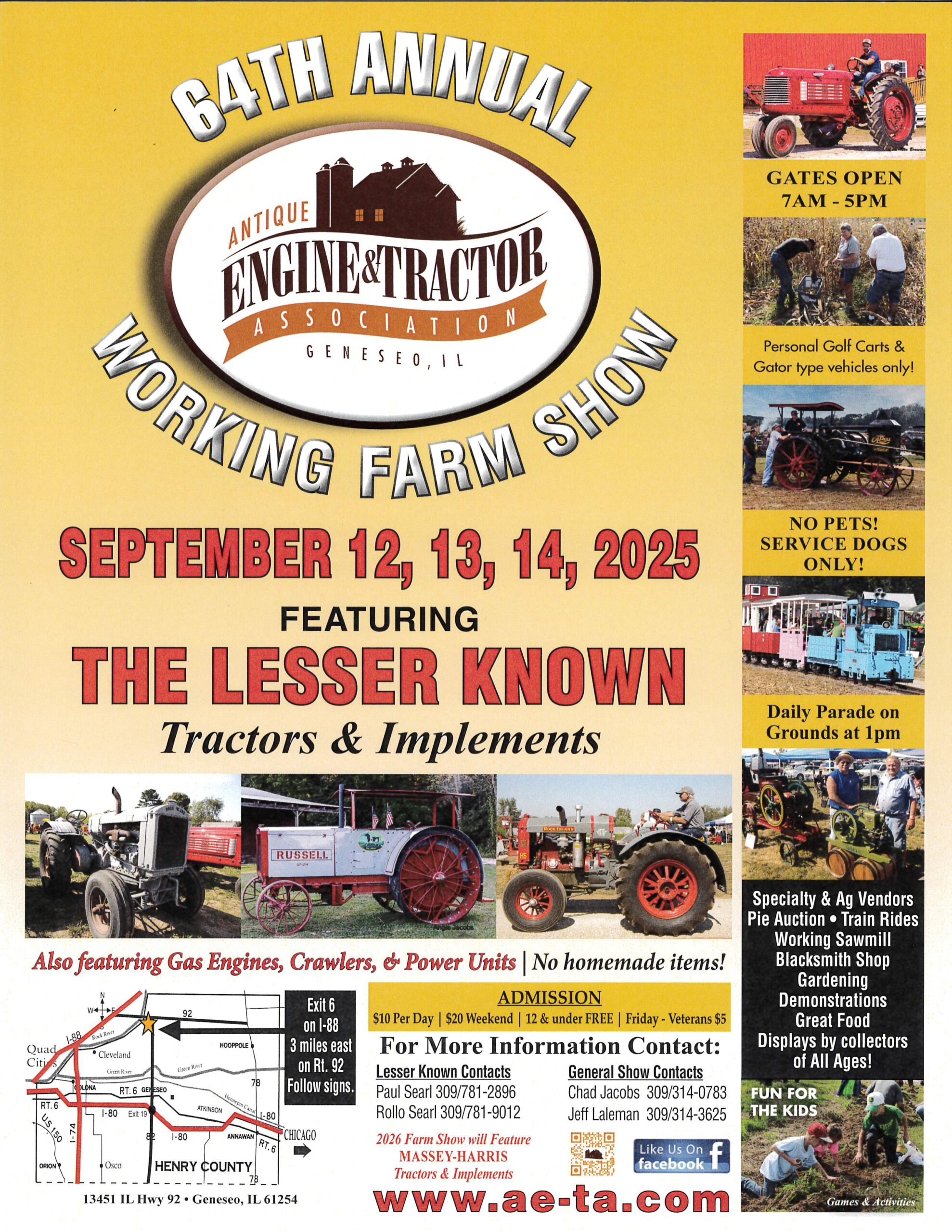 The Antique Engine & Tractor Association (AETA) hosts its annual three-day Working Farm Show, always the second weekend after Labor Day. During this show, the AETA harvest 40 acres of corn and soybeans with mid 1900’s equipment, thresh oats or wheat, run a saw mill, plow, dig potatoes, ride the train, and demonstrate gas engines as they were used from the early to mid-1900’s. The annual show gets bigger each year with hundreds of tractors, garden tractors and many gas engines, plus other agricultural memorabilia on the grounds. Every year the AETA features a different brand of antique tractor.