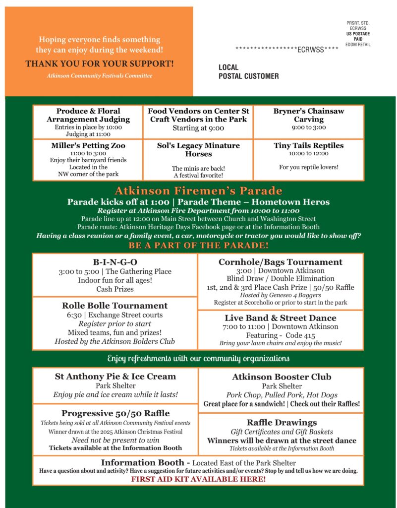 Atkinson Heritage Days 2025 will take place August 22 & 23, 2025, in Atkinson, Illinois. Stay tuned for more updates or visit: https://www.facebook.com/profile.php?id=61560915890263