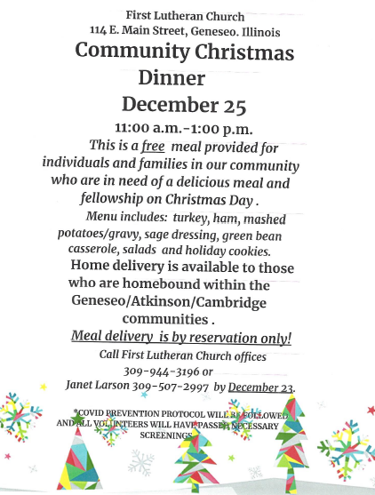 Come out to First Lutheran Church on December 25th from 11am to 1pm for a Christmas Dinner and fellowship. Home delivery is available by reservation for those who are homebound in Geneseo/Atkinson/Cambridge areas.