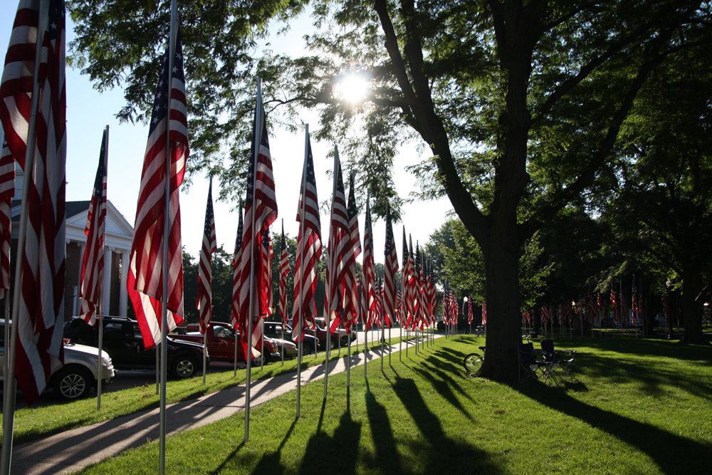 The ‘Aisle of Flags’ started with 50 flags on Memorial Day 1981 in the city park. It was the enthusiasm of three VFW auxiliary members, Naomi Livengood, Pat Miller Johnson and Dorothy Young who wanted to honor their deceased husbands and family members by flying the veterans flags in the “Aisle of Flags”.