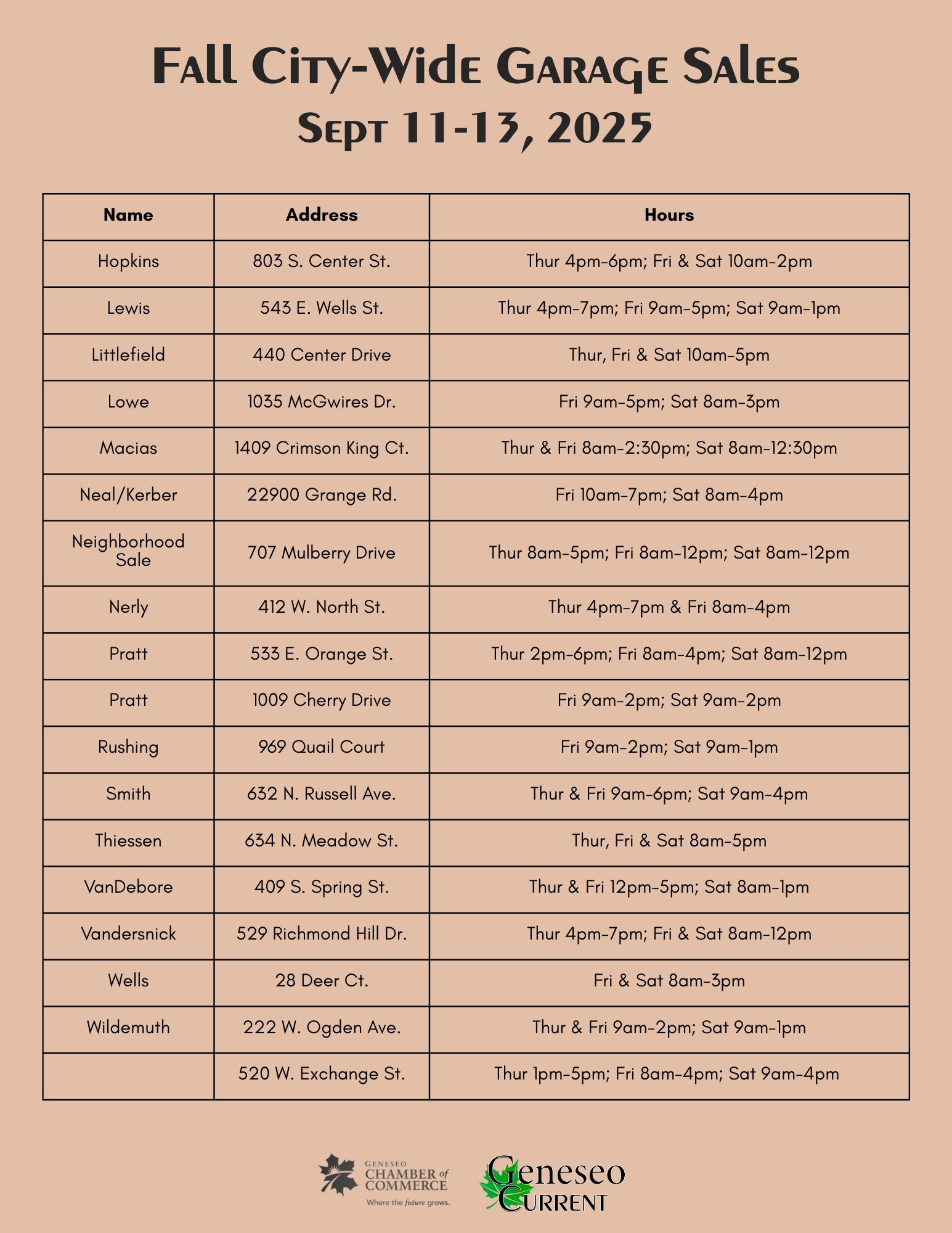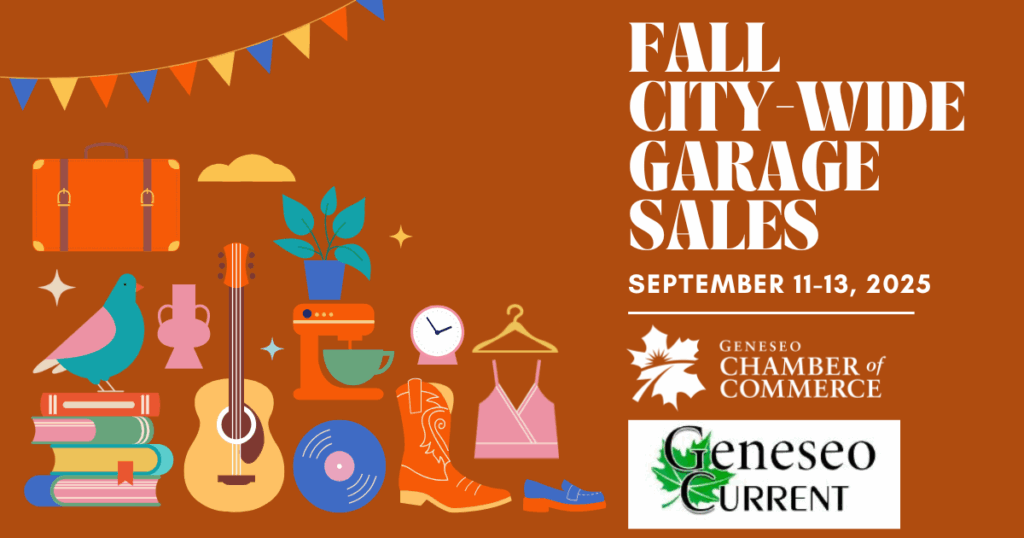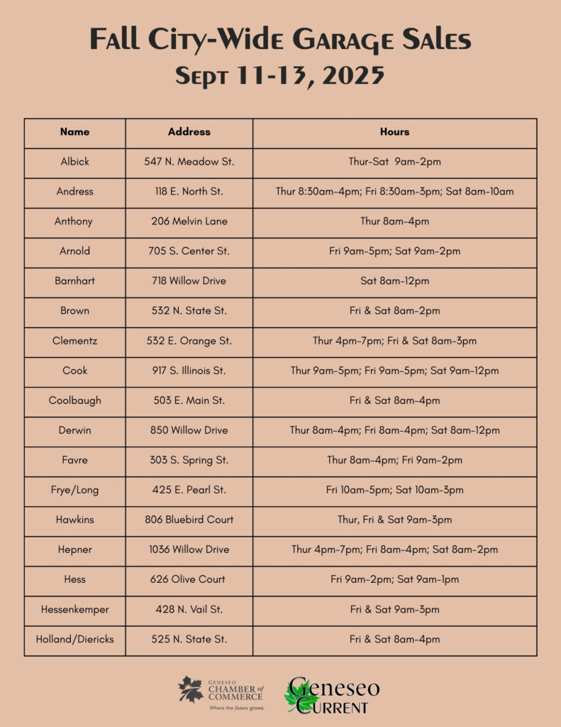 Geneseo is organizing its Fall City-Wide Garage Sales September 11-13, 2025, throughout town. Come to Geneseo and shop some great deals!