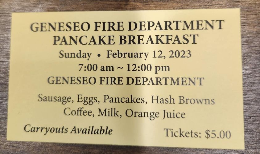 Join us Sunday, February 12th from 7am to 12pm for a pancake breakfast at the Geneseo Fire Deparment! $5 and carryout available.