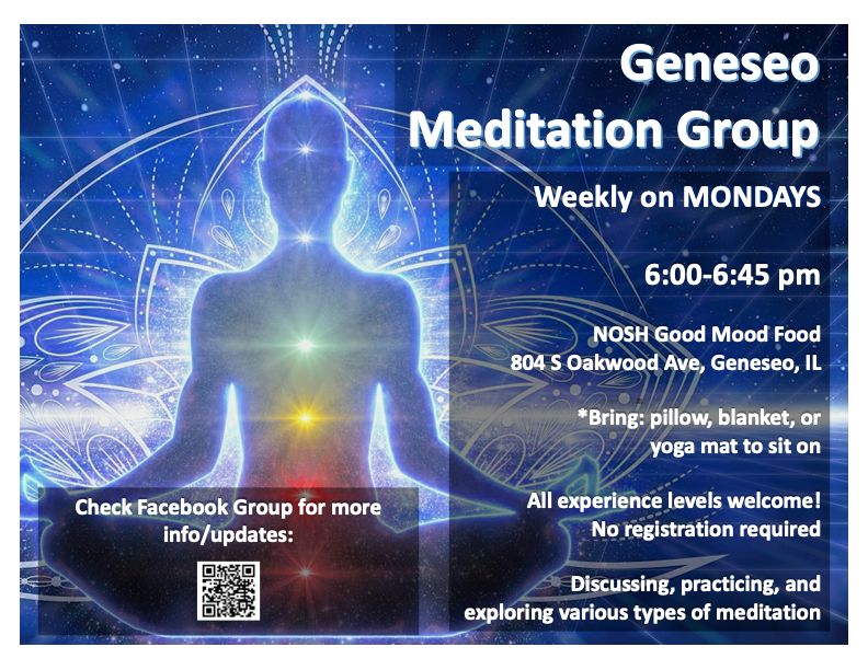 Meets each Monday at 6:00 pm at NOSH Good Mood Food in Geneseo! We explore and practice various types of meditation, and reset the mind before the new week!