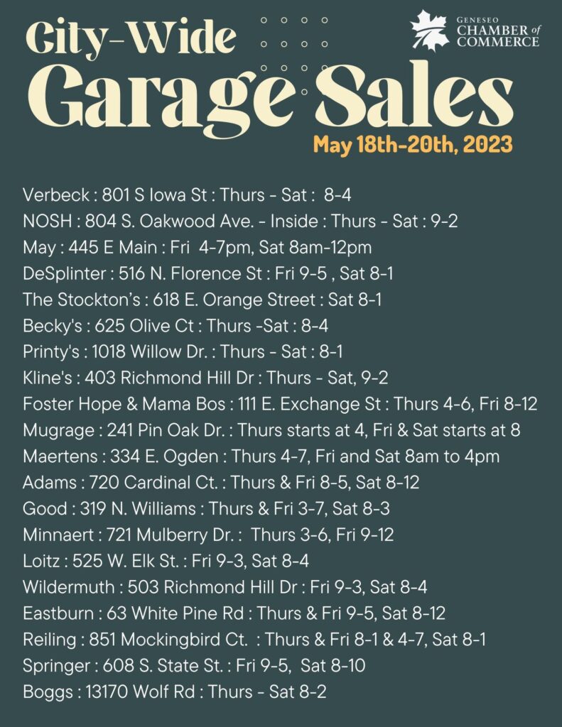 Come out to Geneseo on May 18-20th for our City-wide garage sales! Click HERE for a map.