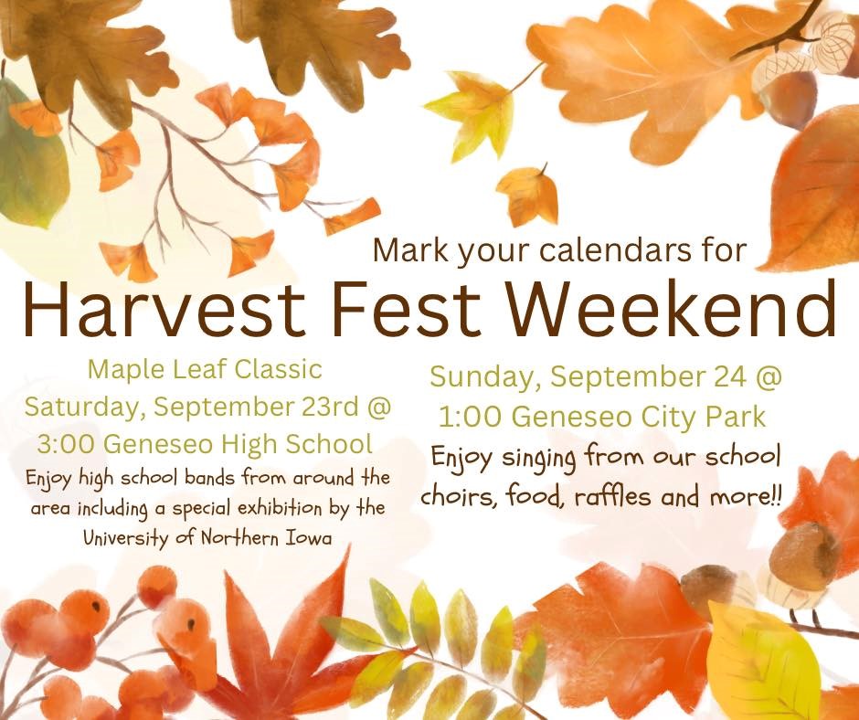 Don’t miss the Maple Leaf Classic on Saturday, September 23rd at 3pm at the Geneseo High School, then the Music in the Park on Sunday, September 24th at 1pm!