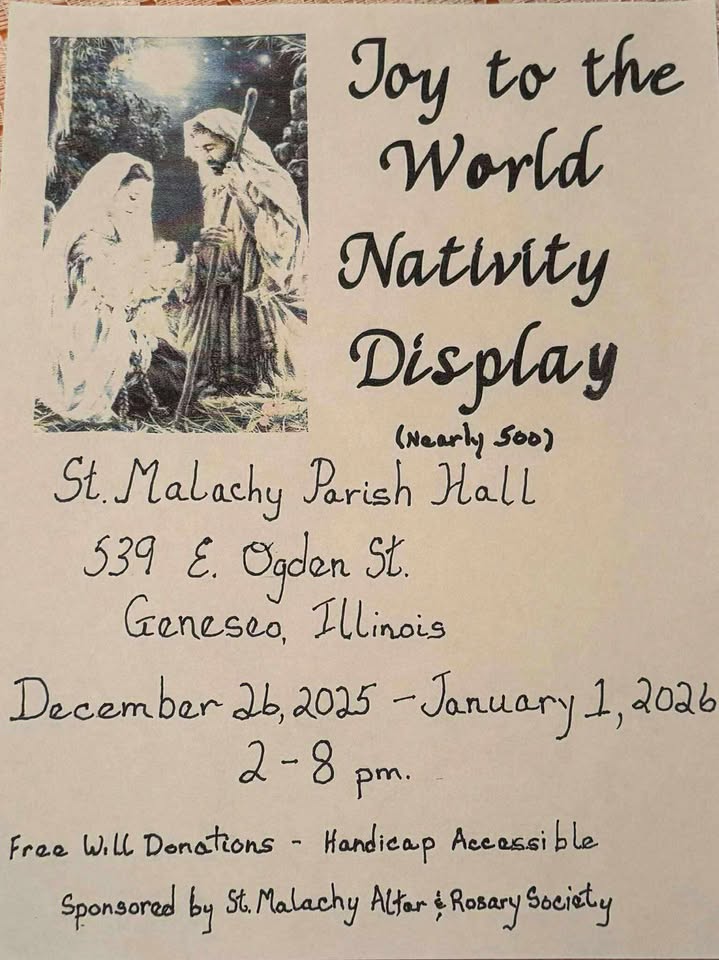 Come enjoy the Joy To The World Nativity Display, on display at St. Malachy Parish, located at 539 E. Ogden Ave.