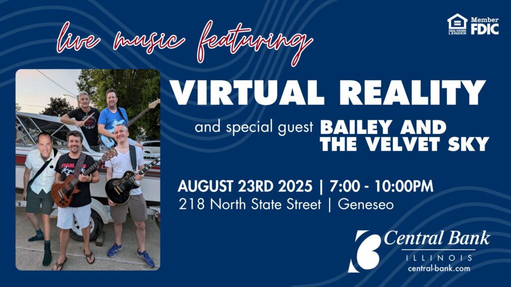 Join Virtual Reality and special guest Bailey and the Velvet Sky at Central Bank Pavilion on Saturday, August 23rd from 7-10pm! Grab a lawn chair and invite your friends to relax and enjoy live music on a summer evening. As this group likes to say: “The Boys are Back in Town!”