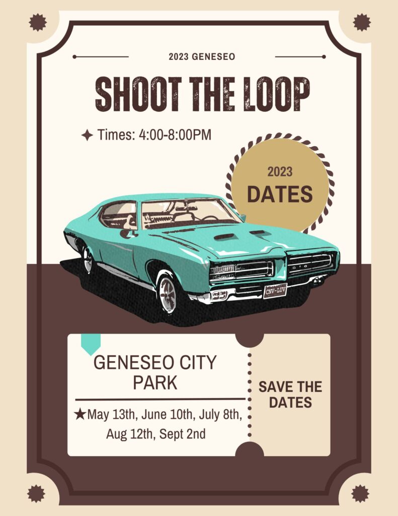 Uncover your ride, clean ‘er up and join us Saturday, June 10th from 4:00-8:00 in Geneseo. Park at the Park. Shoot The Loop. Share your favorite hot rods, cars, trucks and bikes with the Geneseo community. Show all of the Geneseo kids visiting the park a little taste of the car culture. Food, Music, Cruisin’ and a good time.