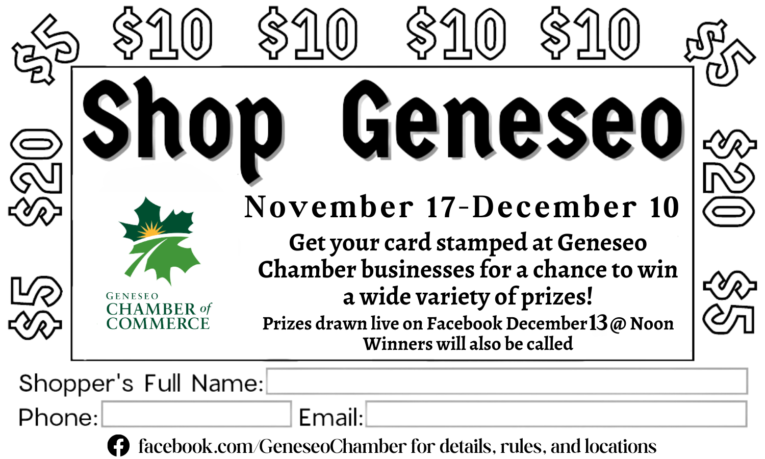 Every $100 you spend at Geneseo Chamber businesses earns you a chance at winning great prizes from our local businesses! Have your Shop Geneseo! card(s) stamped while you’re shopping, or bring your receipts to the Geneseo Chamber to be entered to win! Winners will be drawn live on the Geneseo Chamber Facebook page Wednesday, December 13th at noon!