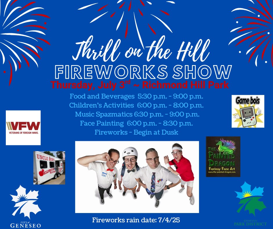 Food and Beverages 5:30 p.m. – 9:00 p.m.Children’s Activities 6:00 p.m. – 8:00 p.m.Music Spazmatics 6:30 p.m. – 9:00 p.m.Face Painting 6:00 p.m. – 8:30 p.m.Fireworks – Begin at Dusk
