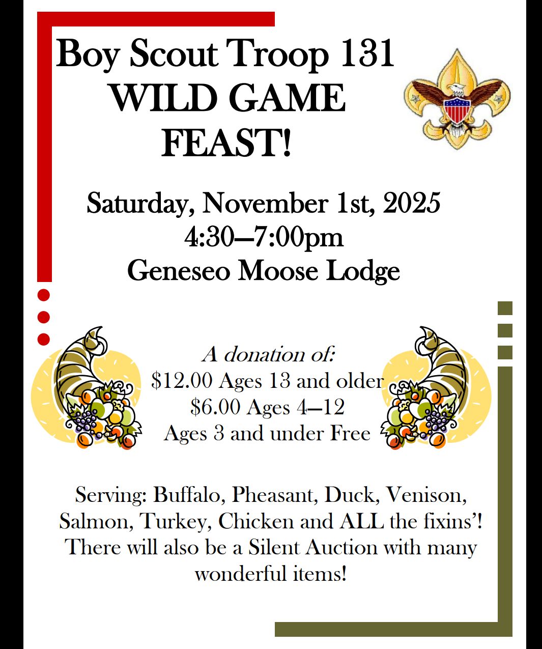 Geneseo Troop 131 Annual Wild Game Feast. Serving buffalo, pheasant, goose, venison, salmon, turkey, chicken, and all the fixins’ … Silent Auction as well.